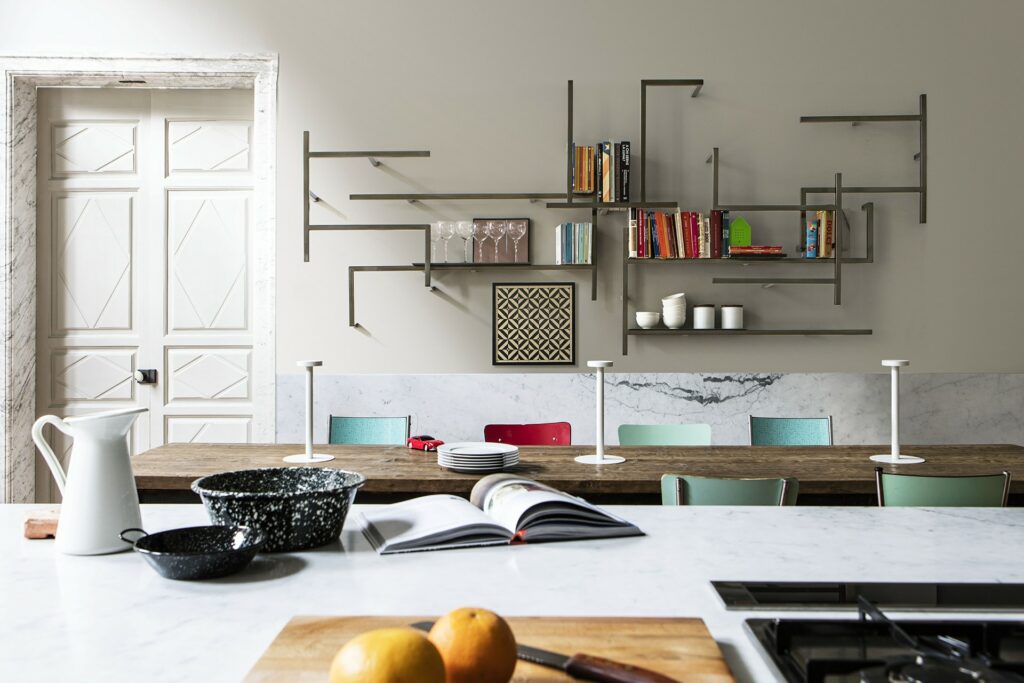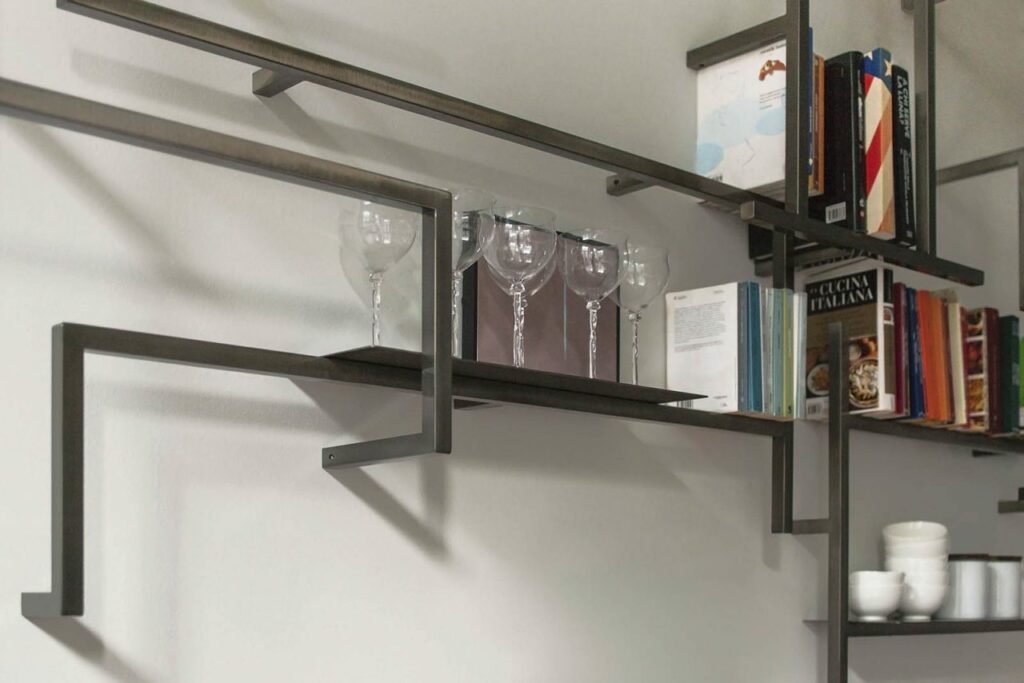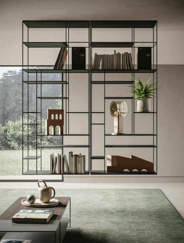 Cette bibliothèque en tube métallique un bon compromis dans un séjour pour un rendu plus léger. Des étagères peuvent être insérées pour placer de la vaisselle.